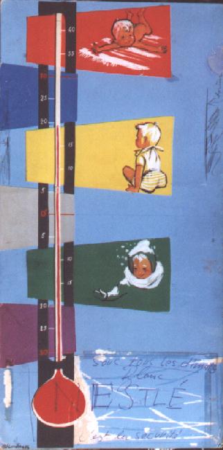 Maquette gouache (à gauche) pour la plaque Nestlé (48 x 23 cm, 1957-1958) tirée à 3000